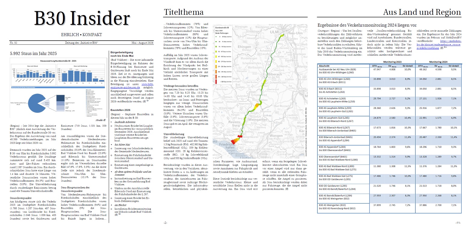 B30 Insider EHRLICH • KOMPAKT Nr. 52 Zeitung der „Initiative B30“ Mai - August 2026 Bürgerbeteiligung noch bis Ende Mai (Bad Waldsee) - Die erste informelle Bürgerbeteiligung im Rahmen der B 30-Planung bei Enzisreute und Gaisbeuren läuft noch bis Ende Mai 2026. Ziel ist es, Anregungen und Ideen aus der Bevölkerung frühzeitig in die Planung einzubeziehen. Eine Beteiligung ist unter www.b30-enzisreute-gaisbeuren.de möglich. Eingegangene Vorschläge werden anschließend ausgewertet und sollen nach derzeitigem Stand im August 2026 veröffentlicht werden. (ff) Q Baustellen 2026 (Region) - Geplante Baustellen in diesem Jahr an der B 30: • laufende Arbeiten o Neubau einer Brücke bei Laupheim-Baustetten bis voraussichtlich Dezember 2026. Anschließend wird eine weitere Brücke bei Laupheim-Baustetten neu gebaut. • bis Mitte Mai o Sanierung von Schachtdeckeln in der Gemeinde Meckenbeuren, o Erneuerung der Fahrbahndecke zwischen Oberessendorf und Unteressendorf, o Erneuerung einer Ampelanlage in Gaisbeuren. • ab dem späten Frühjahr und im Sommer o Instandsetzung an fünf Bauwerken an der Ortsumfahrung Bad Waldsee, o Umbau an der Anschlussstelle Biberach-Nord mit Erneuerung der Fahrbahndecke der L 267, o Sanierung einer Brücke bei Erbach-Dellmensingen. • im Herbst o Installation Brückenmonitoring am Urbachviadukt Bad Waldsee. (ff) Q 5.992 Staus im Jahr 2025 (Region) - Seit 2014 legt die „Initiative B30“ jährlich eine Auswertung der Verkehrsstaus auf der Bundesstraße 30 vor. Das Ergebnis der Auswertung von rund 48.300 Verkehrsmeldungen im Jahr 2025 liegt seit März 2026 vor. Demnach wurden im Jahr 2025 auf der B 30 von Ulm bis Friedrichshafen 5.992 Verkehrsstaus gezählt. Die Staulänge summierte sich auf rund 8.433 km. Auto- und Lkw-Fahrer verbrachten rund 2.387 Stunden im Stau. Ein durchschnittlicher Stau hatte eine Länge von 1,4 km und dauerte 24 Minuten. Wesentliche Stauursachen waren hohes Verkehrsaufkommen (84,3%) und Baustellen (5,8%). Die Umweltbelastung durch staubedingte Emissionen betrug rund 404 Tonnen Umweltschadstoffe. Stauschwerpunkte Am häufigsten staute sich der Verkehr 2025 im Stadtgebiet Friedrichshafen (1.768 Staus, 1.287 Stau-km, 407 Staustunden), von Lochbrücke bis Friedrichshafen (1.046 Staus, 1.056 km, 405 Stunden) sowie bei Gaisbeuren und Enzisreute (719 Staus, 1.531 km, 359 Stunden). Am stauanfälligsten waren die Streckenabschnitte: Meckenbeuren-Hohenreute bis Friedrichshafen einschließlich des Stadtgebiets Friedrichshafen (35,6% der Stau-Kilometer), Bad Waldsee-Nord bis Baindt (23,0%) und Biberach bis Unteressendorf (11,0%). Bemessen an Staustunden ergibt sich im Wesentlichen dasselbe Bild (47,8%, 17,8%, 5,5%): An die dritte Stelle tritt jedoch der Streckenabschnitt Neu-Ulm bis Ulm-Donaustetten (13,1% der Stau-Stunden). Stau-Hauptursachen der Stauschwerpunkte Von Meckenbeuren-Hohenreute bis Friedrichshafen einschließlich des Stadtgebiets Friedrichshafen waren hohes Verkehrsaufkommen (94%) und Baustellen (5%) die Stau-Hauptursachen. Die Stau-Hauptursachen von Bad Waldsee-Nord bis Baindt lagen in hohem… Titelthema …Verkehrsaufkommen (76%) und Schwertransporten (12%). Von Biberach bis Unteressendorf waren hohes Verkehrsaufkommen (80%) und Schwertransporte (12%) die Hauptursachen sowie von Neu-Ulm bis Ulm-Donaustetten hohes Verkehrsaufkommen (78%) und Baustellen (15%). Auffällig im Jahr 2025 waren Schwertransporte. Aufgrund des Ausbaus der Windkraft kam es vor allem durch die Errichtung der Windparks bei Hoßkirch und Mochenwangen zu einer Vielzahl nächtlicher Transporte mit hohen Lasten sowie großen Längen und Breiten. Werktage besonders betroffen Die meisten Staus wurden an Werktagen von 7.20 bis 8.25 Uhr, 13.25 bis 14.05 Uhr und 14.45 bis 18.05 Uhr beobachtet - an Sonn- und Feiertagen hingegen nur wenige. Stauursachen waren vor allem hohes Verkehrsaufkommen (84,3%) und Baustellen (5,8%). Weitere Ursachen waren Unfälle (3,9%), Schwertransporte (3,8%) und die Witterung (1,6%). Die meisten Staus gab es im April, die wenigsten im August. Umweltbelastung Die staubedingte Umweltbelastung belief sich 2025 auf rund 404 Tonnen: 1,5 kg Feinstaub (PM), 402.963 kg Kohlenstoffdioxid (CO2), 339 kg Kohlenmonoxid (CO), 28 kg Kohlenwasserstoffe (HC), 1,9 kg Schwefeldioxid (SO2) und 553 kg Stickstoffoxide (NOX). Berücksichtigt wurden in dieser Auswertung, wie in den Vorjahren, aktualisierte Daten u. a. zu Änderungen im Verkehrsaufkommen, der Verkehrsstruktur, der Antriebsarten im Fahrzeugbestand sowie zulässige Höchstgeschwindigkeiten. Die infrastrukturellen, betrieblichen und physikalischen Parameter, wie Ausbaustand, Streckenlänge, Lage, Längsneigung sowie Annahmen zur Fahrphysik und Aerodynamik blieben unverändert. Diese Statistik berücksichtigt nur wesentliche Verkehrsstaus. Kleine und ortsübliche Staus fließen nicht in die Auswertung ein. Ein Stau wird erst erfasst, wenn ein festgelegter Schwellenwert überschritten wird. Ein Stau vor einer Ampel wird nur dann gezählt, wenn es alle stehenden Fahrzeuge nicht innerhalb einer Grünphase schaffen, die Ampel zu passieren. Als Stau berücksichtigt werden dabei nur Fahrzeuge, die die Ampel nicht passieren konnten. (ff) Titelthema Staubedingte Emissionen CO CO2 HC NOx PM SO2 Im Bereich von Projekt: BPL B030-G10-BW 83 kg/a 47.956 kg/a 5 kg/a 79 kg/a 0,536 kg/a 0,222 kg/a Im Bereich von Projekt: BPL B030-G20-BW 53 kg/a 60.343 kg/a 4 kg/a 101 kg/a 0,440 kg/a 0,279 kg/a Im Bereich von Projekt: BPL B30-G30-BW 36 kg/a 28.005 kg/a 2 kg/a 45 kg/a 0,205 kg/a 0,130 kg/a Bereich Ulm mit Neu-Ulm 79 kg/a 114.748 kg/a 7 kg/a 132 kg/a 0,078 kg/a 0,532 kg/a Bereich Biberach-Süd mit Hochdorf 36 kg/a 28.005 kg/a 2 kg/a 45 kg/a 0,205 kg/a 0,130 kg/a Bereich Gaisbeuren mit Enzisreute 53 kg/a 60.343 kg/a 4 kg/a 101 kg/a 0,440 kg/a 0,279 kg/a Bereich Ravensburg mit Weingarten 37 kg/a 52.708 kg/a 3 kg/a 60 kg/a -0,032 kg/a 0,244 kg/a Bereich Meckenbeuren 50 kg/a 25.949 kg/a 3 kg/a 48 kg/a 0,347 kg/a 0,120 kg/a